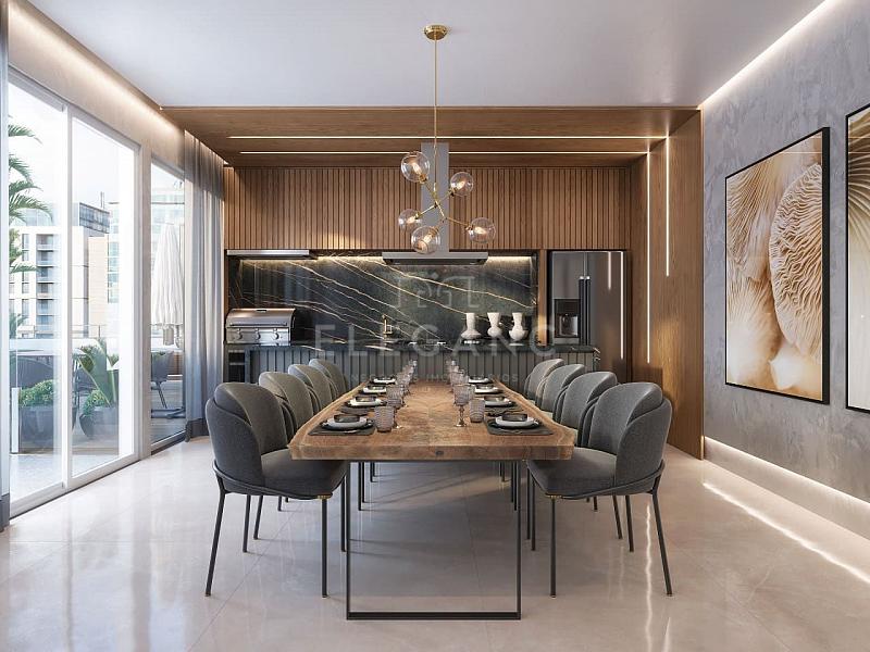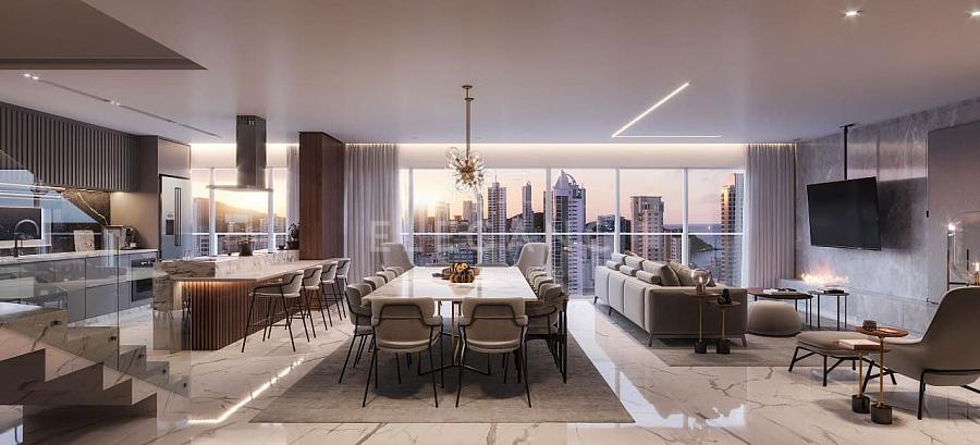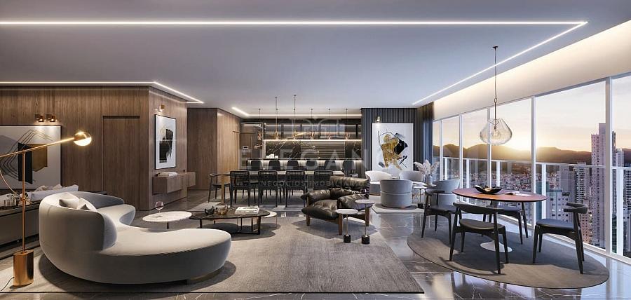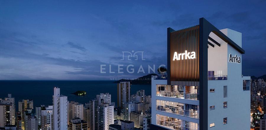 Apartamento no Edifício Timeless Arrka at Alvin em Balneário Camboriú com 143m² privativos, 04 suítes sendo 01 suíte master com closet, lavabo social, amplo living integrado com sala de estar e sala de jantar, cozinha gourmet, sacada, churrasqueira à carvão, área de serviço e 03 vagas de garagem.