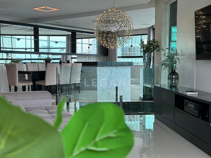 ESPETACULAR NA BARRA SUL - Cobertura Duplex no Edifício Grand Royale em Balneário Camboriú com 280m² privativos, mobiliado, equipado e finamente decorado, 04 suítes sendo 01 suíte master com banheira de hidromassagem, sala de estar e jantar integradas, cozinha gourmet, piscina aquecida privativa, área de serviço, área social, área íntima e 04 vagas de garagem. Empreendimento com área de lazer completa e localizado próximo ao mar, na região mais renomada da cidade local conhecido por sua tranquilidade e elegância, Barra Sul de Balneário Camboriú.